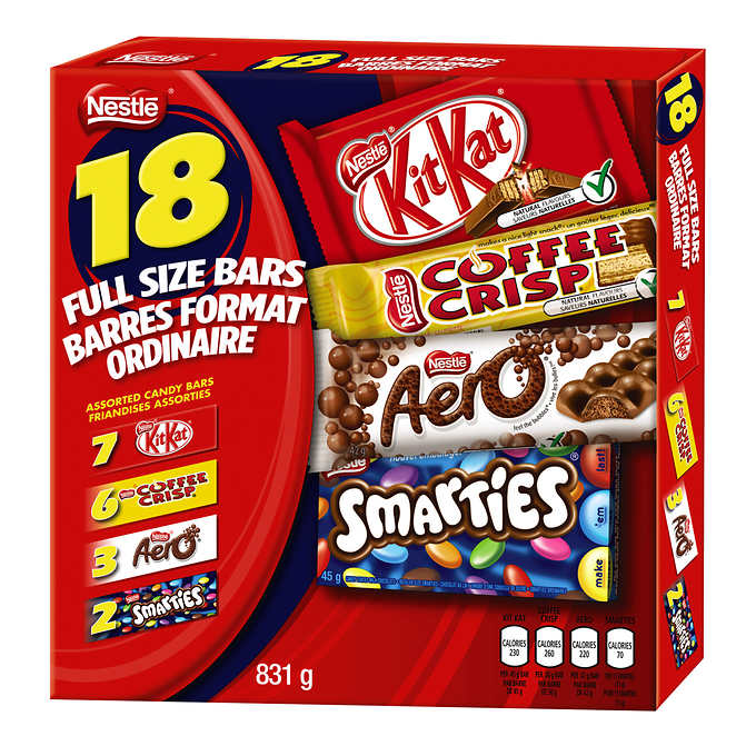 Nestlé assorted chocolate bars. 7 kit kat bars, 6 coffee crisp bars. 3 aero bars. 2 smarties. Pack of 18